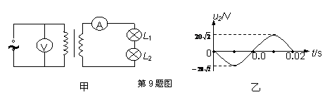 9.(12分)如图所示,其中甲图是由理想变压器、交流电表和灯泡L1、L2组成的电路;乙图为副线圈的电压u2- t图象.已知原、副线圈的匝数之比为nl∶n2=10∶1,安培表的示数I2为2 A,各电表和导线的电阻可以忽略不计,求: