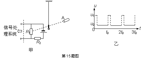 15.某同学用时间传感器代替了秒表做“用单摆测定重力加速度”的实验,他的设计如图甲所示:长为L的摆线一端固定在铁架台上,另一端连接一质量为m、半径为r的小球,在摆线上紧临小球套有一小段轻细挡光管.当单摆摆动到平衡位置时,挡光管能挡住从光源A正对光敏电阻R1发出的细光束,信号处理系统就能形成一个电压信号,光敏电阻R1两端电压u与时间t的关系如图乙所示,R2为定值电阻![]()