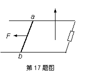 17、(12分)如图所示,匀强磁场竖直向上穿过水平放置的金属框架,磁感应强度B=0.5T,框架宽L=0.2m,右端接有电阻R=1Ω.一根质量为m=0.2kg、电阻不计的金属棒ab与框架动摩擦因数为μ=0.2,在水平向左的恒力F=0.5N作用下,从静止开始沿框架向左运动,当ab棒达到最大速度后,撤去F,测得ab棒从开始做减速运动直至停止的过程中,通过棒横截面的电量为q=1C.求:(g取10m/s2)