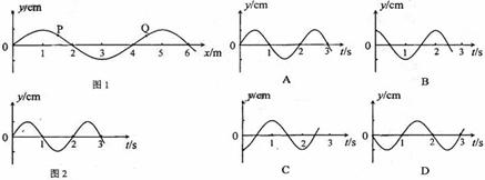 一列简谐横波在某一时刻的波形图如图1所示,图中P、Q两质点的横坐标分别为x=1.5m和x=4.5m。P点的振动图像如图2所示。在下列四幅图中,Q点的振动图像可能是( )