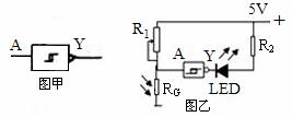 图甲为斯密特触发器,当加在它的输入端A的电压逐渐上升到某个值(1.6V)时,输出端Y会突然从高电平跳到低电平(0.25V),而当输入端A的电压下降到另一个值的时候(0.8V),Y会从低电平跳到高电平(3.4V)。图乙为一光控电路,用发光二极管LED模仿路灯,RG为光敏电阻。关于斯密特触发器和光控电路的下列说法中正确的是