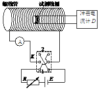 12. 如图所示是测量通电螺线管A内部磁感应强度B及其与电流I关系的实验装置。将截面积为S、匝数为N的小试测线圈P置于通电螺线管A中间,试测线圈平面与螺线管的轴线垂直,可认为穿过该试测线圈的磁场均匀,将试测线圈引线的两端与冲击电流计D相连。拨动双刀双掷换向开关K,改变通入螺线管的电流方向,而不改变电流的大小,在P中产生的感应电流引起D的指针偏转。