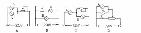 11. 将规格为 “110V, 60W”和“110V, 40W”的A灯和B灯接到电路中去,既要使灯正常发光,又要使电路消耗的功率最小,如图所示四种电路中接法最合理的是
