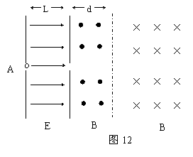 如图12所示,空间分布着图示的匀强电场E(宽为L)和匀强磁场B,一带电粒子质量为m,电量为q(不计重力),从A点由静止释放后经电场加速后进入磁场,穿过中间磁场进入右边磁场后能按某一路经再返回A点而重复前述过程。(虚线为磁场分界线,并不表示有什么障碍物)。