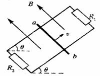 13.如图所示,平行金属导轨与水平面成θ角,导轨与两相同的固定电阻R1和R2相连,匀强磁场垂直穿过导轨平面。有一导体棒ab,质量为m,导体棒的电阻R=2R1,与导轨之间的动摩擦因数为μ,导体棒ab沿导轨向上滑动,当上滑的速度为v时,固定电阻R1消耗的热功率为P,此时 ( )