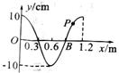 (10分)如图所示为简谐波某时刻的波形图,此时P点振动方向向下,波速为2.4m/s,再经过t=9/8s时,B点的位移、B点通过的路程和波传播的距离分别为多少?