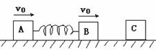 (5)光滑水平面上,用弹簧相连接的质量均为2kg的A、B两物体都以V0=6m/s速度向右运动。弹簧处于原长。质量为4kg的物体C静止在前方,如图所示,B与C发生相碰后合在一起运动,在以后的运动中,