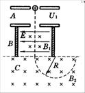 (14分)如图所示为质谱仪的原理图,A为粒子加速器,电压为U1;B为速度选择器,磁场与电场正交,磁感应强度为B1,板间距离为d;C为偏转分离器,磁感应强度为B2。今有一质量为m、电量为q的正离子经加速后,恰好通过速度选择器,进入分离器后做半径为R的匀速圆周运动,求: