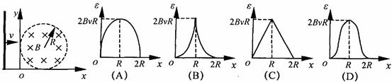 如图所示,平行于y轴的导体棒以速度v向右匀速直线运动,经过半径为R、磁感应强度为B的圆形匀强磁场区域,导体棒中的感应电动势ε与导体棒位置x关系的图像是: