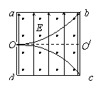 (10分)正方形abcd内有方向如图的场强为E的匀强电场和磁感应强度为B的匀强磁场。质子流从ad边的中点O以初速度v0,沿着与ab平行的方向射入正方形区域。若撤去匀强磁场,质子将达到b点;若撤去匀强电场,质子将打到c点。求:⑴E∶B ⑵当匀强电场和匀强磁场同时存在时,为使质子沿原方向射入后能做直线运动而打到bc边的中点O/,其初速度应调整为v0的多少倍?