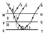 平面MN.PQ.ST为三个相互平行的界面,Ⅰ、Ⅱ、Ⅲ为三种不同的介质,平面ST的上表面涂有反射层(光线不能通过)。某种单色光线射向界面MN后,发生了一系列的反射和折射现象,光路如图11所示。则( )