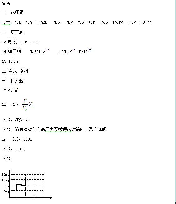 19.如图所示,水平放置的汽缸内壁光滑,活塞厚度不计,在A、B两处设有限制装置,使活塞只能在A、B之间运动,B左面汽缸的容积为V0,A、B之间的容积为0.1V0。开始时活塞在B处,缸内气体的压强为0.9p0(p0为大气压强),温度为297K,现缓慢加热汽缸内气体,直至399.3K。求: