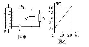24.(12分)在如图甲所示的电路中,螺线管匝数n = 1500匝,横截面积S = 20cm2。螺线管导线电阻r = 1.0Ω,R1 = 4.0Ω,R2 = 5.0Ω,C=30μF。在一段时间内,穿过螺线管的磁场的磁感应强度B按如图乙所示的规律变化。求: