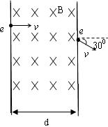 21、(10分)如图所示,一束电子(电荷量为e)以速度v垂直边界射入磁感应强度为B,宽为d的匀强磁场中,穿过磁场时速度方向与电子原来入射方向的夹角为300,求:
