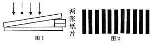 在一端夹入两张纸片,从而在两玻璃表面之间形成一个劈形空气薄膜.当光垂直入射后,从上往下看到的干涉条纹如图2所示。干涉条纹有如下特点:(1)任意一条明条纹或暗条纹所在位置下面的薄膜厚度相等;(2)任意相邻明条纹或暗条纹所对应的薄膜厚度差恒定。现若在图(1)装置中抽去一张纸片,则当光垂直入射到新的劈形空气薄膜后。则条纹