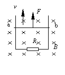 (16分)如图所示,在磁感强度为B、方向垂直纸面向里的匀强磁场中,有一竖直放置的光滑导电轨道,宽度为L、轨道间接有电阻R.靠在轨道上的金属杆ab,质量为M 、 电阻为r,与轨道接触良好。现用竖直向上的拉力,使ab杆沿轨道以速度v匀速上滑(轨道电阻不计).