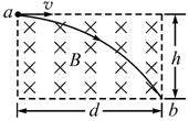 (15分)如图所示,一电子从a点以一定速度垂直进入长为d、宽为h的矩形磁场区域沿曲线ab运动,且通过b点离开磁场。已知电子的质量为m,电量为e,磁场的磁感应强度为B,不计重力,求: