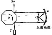 如图所示是迈克尔逊用转动八面镜法测光速的实验示意 图,图中S为发光点,T是望远镜,平面镜O与凹面镜B构成了反射系统.八面镜距反射系统的距离为AB=L(L可长达几十千米),且远大于OB以及S和T到八面镜的距离.现使八面镜转动起来,并缓慢增大其转速,当转动频率达到