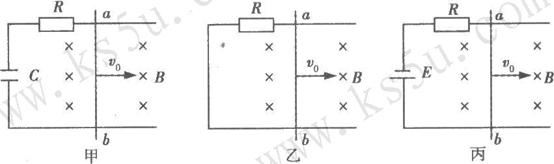12.在图甲、乙、丙三图中,除导体棒ab可动外,其余部分均固定不动,甲图中的电容器C原来不带电.设导体棒、导轨和直流电源的电阻均可忽略,导体棒和导轨间的摩擦也不计,图中装置均处在水平面内,且都处于方向垂直水平面(即纸面)向下的匀强磁场中,导轨足够长.今给导体棒ab 一个向右的初速度v0,在甲、乙、丙三种情形下导体棒ab的最终运动状态是