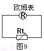 15.(4分)如图9所示,将多用表的选择开关置于“欧姆”挡,再将电表的两支表笔与负温度系数的热敏电阻Rt(负温度系数热敏电阻是指阻值随温度的升高而减小的热敏电阻)的两端相连,这时表针恰好指在刻度盘的正中间.若往Rt上擦一些酒精,表针将向 (填"左"或"右")移动;若用吹风机将热风吹向电阻Rt,表针将向 (填"左"或"右")移动.
