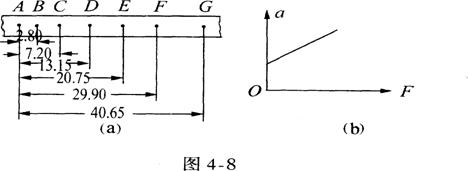 10、(4分)如图4-8(a)为《验证牛顿第二定律》的实验中用打点计时器打出的一条较理想的纸带.纸带上A、B、C、D、E、F、G为七个相邻的计数点,相邻计数点间的时间是0.1 s,距离如图,单位是cm,小车的加速度是________m/s2,在验证质量一定时加速度以和合外力F的关系时,某学生根据实验数据作出了如图4-8(b)所示的a-F、图象,其原因是_____.