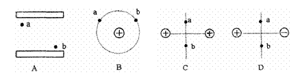 如下图所示的情况中,a、b两点电势相等、电场强度也相同的是: