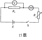 15. 图为用伏安法测量电阻的原理图。图中电压表的内阻为4000Ω;电流表的内阻为50Ω。E为电源,R为电阻箱,Rx为待测电阻,S为开关。当开关闭合后电压表读数U=l.6V,电流表读数I=2.0mA。若将