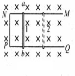 如图所示,有一U形金属导轨MNPQ,处在与它垂直的匀强磁中.有一导体棒ab在导轨上向右匀速运动,经过0. 1 s,从“1”位置运动到“2”位置.这个过程中,穿过由导轨和导体棒组成的闭合回路的磁通量从0. 05Wb增加到0. 15Wb。求: