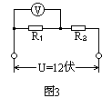 两个定值电阻R1、R2串联后接在输出电压U稳定于12伏的直流电源上。有人把一个内阻不是远大于R1、R2的电压表接在R1两端,如图所示,电压表的示数为8伏。如果把此电压表改接在R2的两端,则电压表的示数将