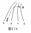 如图(5)所示,a、b、c、d为某电场中的四个等势面,一带正电的粒子飞入电场后,只在电场力作用下沿M点到N点的虚线运动,由此可知,这四个等势面的电势