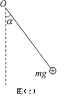 9.如图(6)所示,绝缘细线一端固定于O点,另一端连接一带电荷量为q,质量为m的带正电小球,要使带电小球静止时细线与竖直方向成а角,可在空间加一匀强电场则当所加的匀强电场沿着什么方向时可使场强最小?这时细线中的张力多大?(16分)