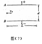 10、如图(7)所示,两带电平行板A、B间的电场为匀强电场,场强E=4.0×102V/m,两板相距d=16㎝,板长L=30㎝。一带电量q=1.0×10-16C、质量m=1.0×10-22㎏的粒子沿平行于板方向从两板的正中间射入电场后向着B板偏转,不计带电粒子所受重力,求: