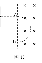 23、(7分)如图13所示,质量为为m、电量为q的带电粒子,经电压为U加速,又经磁感应强度为B的匀强磁场后落到图中D点,求:(1)A、D间的距离(2)粒子在磁场中运动的时间。