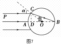 15. (12分)如图7所示是一透明的圆柱体的横截面,其半径R=20 cm,折射率为,AB是一条直径,今有一束平行光沿AB方向射向圆柱体,试求:
