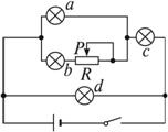 P向右移动,总电阻增大,总电流减小,路端电压增大,d灯变亮,通过d的电流增大;从而通过c灯的电流减小,c灯变暗,c灯两端电压降减小;a灯两端电压增大,a灯变亮;通过a灯的电流增大;通过b灯的电流减小,b灯变暗.