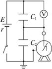 解析:合上开关K瞬间,电路里有电流,电容器被充电;当电路达到稳定状态后,电路里没有电流,故电压表中因无电流通过而读数为零,且电压表相当于一个大电阻将电容器C1短路,电源电压E全加在电容器C2的两端,故与电容器C2并联的静电计的读数为E.