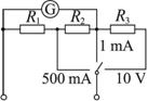 V电压挡,由图可知是 R1、R2串联后与Rg并联,然后再跟R3串联,设R1、R2?串联与Rg并联的总电阻为R′,则![]()