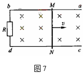 10. 如图7所示,两根相距为l的平行直导轨ab、cd,b、d间连有一固定电阻R,导轨电阻可忽略不计。MN为放在ab和cd上的一导体杆,与ab垂直,其电阻也为R。整个装置处于匀强磁场中,磁感应强度的大小为B,磁场方向垂直于导轨所在平面(指向图中纸面内),现对MN施力使它沿导轨方向以速度v向右做匀速运动。令U表示MN两端电压的大小,则( )