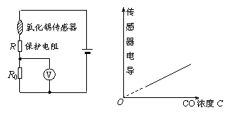 氧化锡传感器主要用于汽车尾气中一氧化碳浓度的检测,它的电阻随一氧化碳浓度的变化而变化。在如左图所示的电路中,不同的一氧化碳浓度对应着传感器的不同电阻,这样显示仪表(电压表)的指针就与CO浓度有了对应关系,观察仪表指针就能判断CO浓度是否超标。有一种氧化锡传感器,其技术资料中给出的是传感器电导(即电阻的倒数)-CO浓度C的关系曲线如右图所示,则电压表示数U0与CO浓度C之间的对应关系应该是