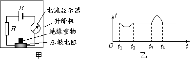 13.压敏电阻的阻值随所受压力的增大而减小。某实验小组在升降机水平地面上利用压敏电阻设计了判断升降机运动状态的装置。其工作原理图如图甲所示,将压敏电阻、定值电阻R、电流显示器、电源E连成电路,在压敏电阻上放置一个绝缘重物。0-t1时间内升降机停在某一楼层处,t1时刻升降机开始运动,从电流显示器中得到电路中电流i随时间t变化情况如图乙所示。则下列判断正确的是