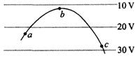 11.、如图所示,三条平行等距的直线表示电场中的三个等势面,电势值分别为10 V、20 V、30 V,实线是一带负电的粒子(不计重力),在该区域内的运动轨迹,对于这轨道上的a、b、c三点来说,下列选项说法正确的是(