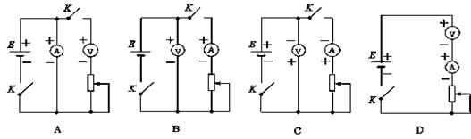 可用理想电压表V、理想电流表A、变阻器R以及电键K和导线等器材来测量某一电源E的电动势和内阻.下面给出了四个电路图,图中+、-代表电源的正、负极和电表的正负接线柱.正确的电路图是 ( )