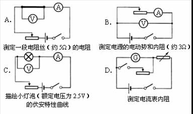 10.某同学欲采用如图8所示的电路完成相关实验。图中电流表的量程为0.6A,内阻约0.1Ω;电压表的量程为3V,内阻约6kΩ;G为小量程电流表;电源电动势约3V,内阻较小,下列电路中正确的是( )