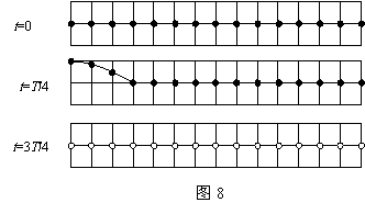 细绳的一端在外力作用下从t=0时刻开始做简谐运动,激发出一列简谐横波。在细绳上选取15个点,图8中第一个图为t=0时刻各点所处的位置,图8中第二个图为t=T/4时刻的波形图(T为波的周期)。在图8中第三个图中画出t=3T/4时刻的波形图。
