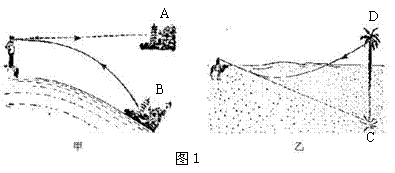 2. 如图1所示, 夏天,在平静无风的海面上,向远方望去,有时能看到山峰、船舶、楼台、亭阁、 集市、庙宇等出现在远方的空中。沙漠里有时也会看到远处的水源、仙人掌近在咫尺,可望而不可及,这就是“蜃景”。下列有关蜃景的说法中错误的是( )
