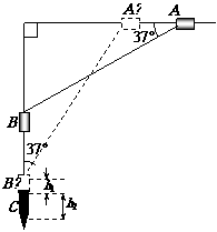 (15分)某机械打桩机原理可简化为如图所示,直角固定杆光滑,杆上套有mA=55kg和mB=80kg两滑块,两滑块用无弹性的轻绳相连,绳长为5m,开始在外力作用下将A滑块向右拉到与水平夹角为37°时静止释放,B滑块随即向下运动带动A滑块向左运动,当运动到绳与竖直方向夹角为37°时,B滑块(重锤)撞击正下方的桩头C,桩头C的质量mC=200kg。碰撞时间极短,碰时A滑块由缓冲减速装置让其立即静止,B滑块碰后反弹上升h1=0.05m,C桩头朝下运动h2=0.2m静止。(取g=10m/s2,sin370=0.6)求: