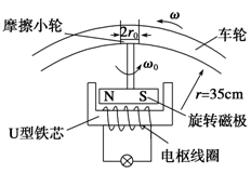 19、(12分)如图所示是一种自行车上照明用的车头灯发电机的结构示意图,转轴的一端装有一对随轴转动的磁极,另一端装有摩擦小轮.电枢线圈绕在固定的U形铁芯上,自行车车轮转动时,通过摩擦小轮带动磁极转动,使线圈中产生正弦交变电流,给车头灯供电.已知自行车车轮半径r=35 cm,摩擦小轮半径r0=1.00 cm,线圈有n=800匝,线圈框横截面积S=20 cm2,总电阻R1=40Ω.旋转磁极的磁感应强度B=0.010 T,车头灯电阻R2=10Ω.当车轮转动的角速度ω=8 rad/s时求: