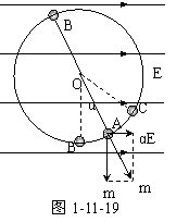 20.(10分) 如图1-11-19所示,一条长为L的绝缘细线上端固定,下端拴一质量为m的带电小球,将它置于水平方向的匀强电场中,场强为E,已知当细线与竖直方向的夹角为α时,小球处于平衡位置A点,问在平衡位置以多大的速度VA释放小球,刚能使之在电场中作竖直平面内的完整圆周运动?