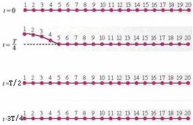 如图是某绳波形成过程的示意图,质点1在外力作用下沿竖直方向做简谐运动,带动2,3,4,…各个质点依次上下振动,把振动从绳的左端传到右端。已知t=0时,质点1开始向上运动,t=T/4时,质点1到达最上方,而质点5开始振动,请在下图中画出t=T/2和t=3T/4时刻绳上各质点的状态。