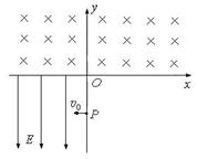 21.如图所示,在xoy平面内的第三象限中有沿y轴负方向的匀强电场,场强大小为E。在第一和第二象限有匀强磁场,方向垂直于直角坐标平面向里。今有一个质量为m、电荷量为e的电子,从y轴的P点以初速度v0垂直于电场方向进入电场(不计电子所受重力),经电场偏转后,沿着与x轴负方向成45°进入磁场,并能返回到原出发点P。求: